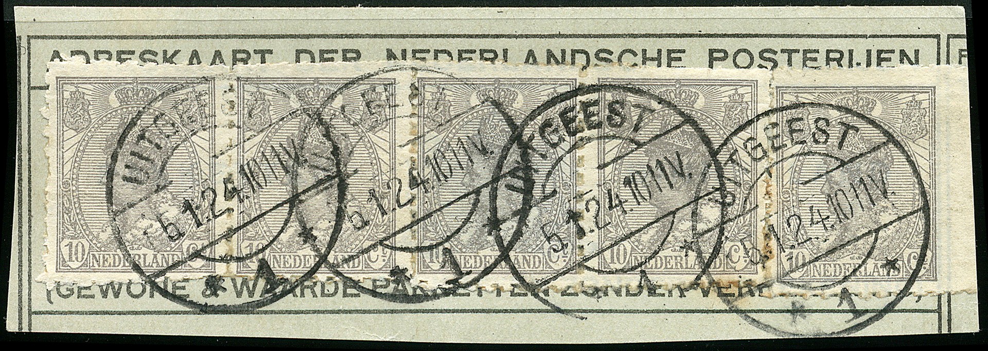 83, 10 cent met door het hulppostkantoor Uitgeest zelf aangebrachte noodtanding in strip van vijf op knipsel uit een postpakketkaart voor een binnenlands pakket, afgestempeld op 5-1-1924. Uitermate zeldzaam, ook omdat de strip uit 1924 is. Beschreven in HPN.A9-87