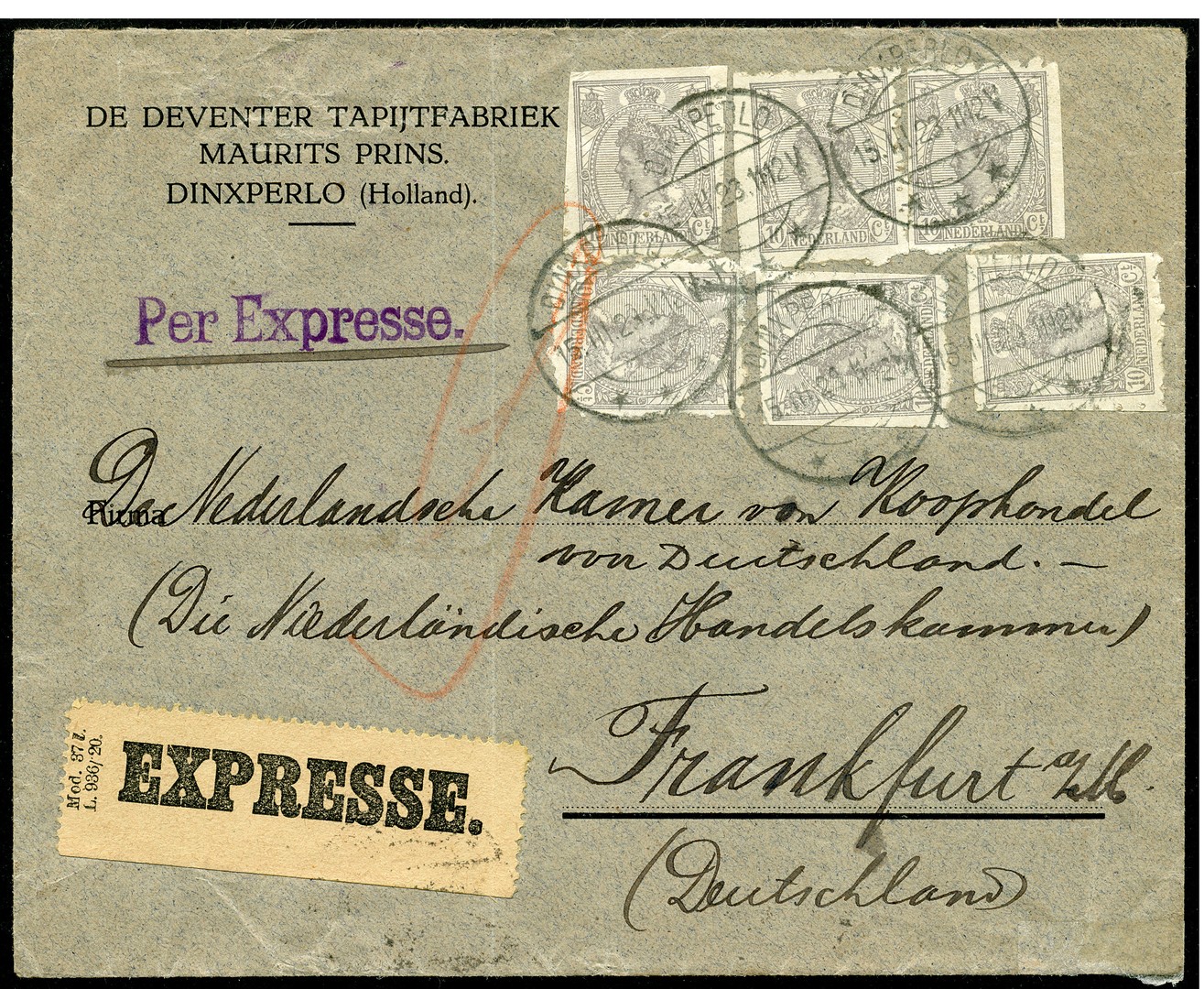 83, zes exemplaren van 10 cent, van een noodtanding voorzien, op een per expresse verzonden firmacouvert (vert. vouw, niet door zegels) van Dinxperlo 15-3-1923 naar Frankfurt 16-3. Mogelijk is deze ruwe noodperforatie aangebracht door de Deventer Tapijtfabriek zelf. Mogelijk unieke brief! Afgebeeld en beschreven in HPN.A9-88 afb. 167