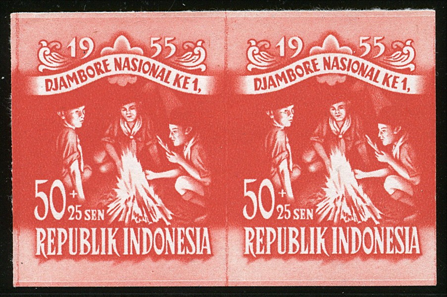 KPI.96A/100A. Tweede Nationale Sportweek 1951, ongetand, ongegomd, in paren (10s en 30s vouw, niet meegeteld), tevens KPI.137A/141A, Eerste Nationale Jamboree 1955, ongetand, ongegomd, in prachtparen. Rp. 34.000.000