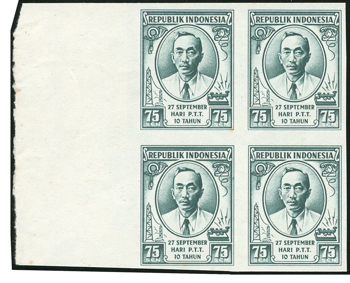 KPI.146A/149A, 10 Jaar Indonesische PTT met Mas Soeharto, ongetand en ongegomd, randblokken van vier. Rp. 8.000.000