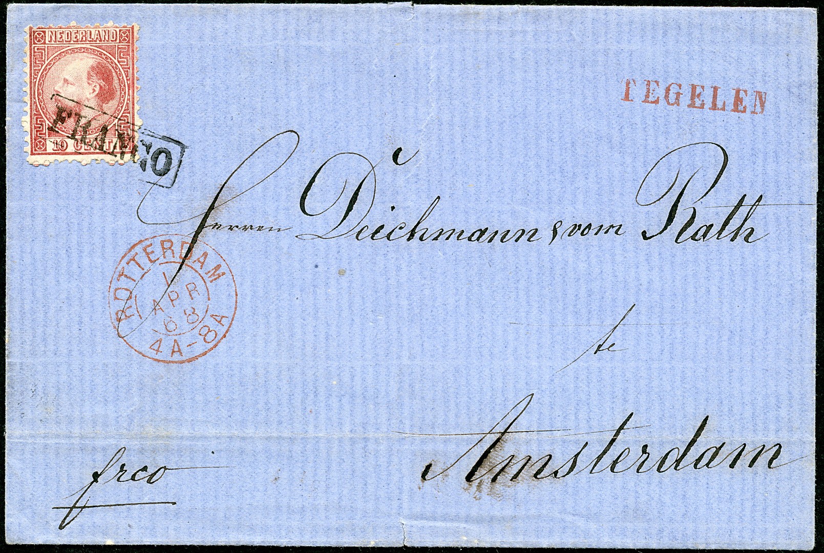 10 Cent nr. 8IA geschreven in Steijl bij Venlo op 31/3 1868 via Tegelen (naamstempel met schreefletters in rood) merkwaardig genoeg over Rotterdam 1-4-1868 naar Amsterdam 2-4. Is de verzending over Rotterdam per abuis?