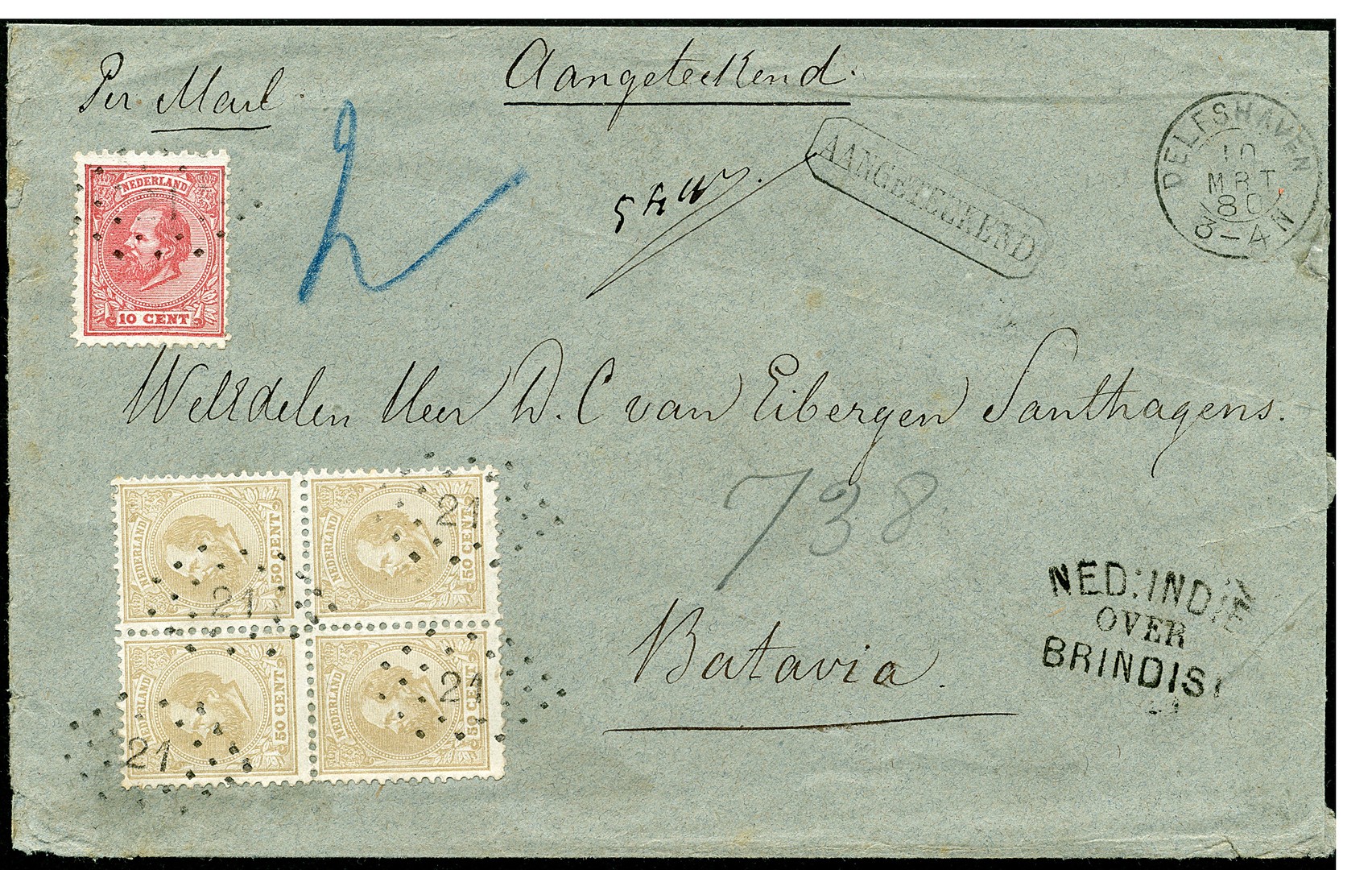 50 Cent in gecombineerde tanding 11½ : 11 gr.g. en 12½ : 12 gr.g. nrs. 27J = 27H en dat in blok van vier (linker zegel boven heeft linksboven aangezet hoektandje, overigens prachtblok), alsmede 10c nr. 21J op een iets gerepareerde grijsgroene envelop van 54 gram, aangetekend van Delfshaven 10-3-1880 (zegels afgestempeld met nummerstempel 21) per landmail over Brindisi (routestempel) naar Weltevreden 12-4. Spectaculaire brief en tentoonstellingsstuk!