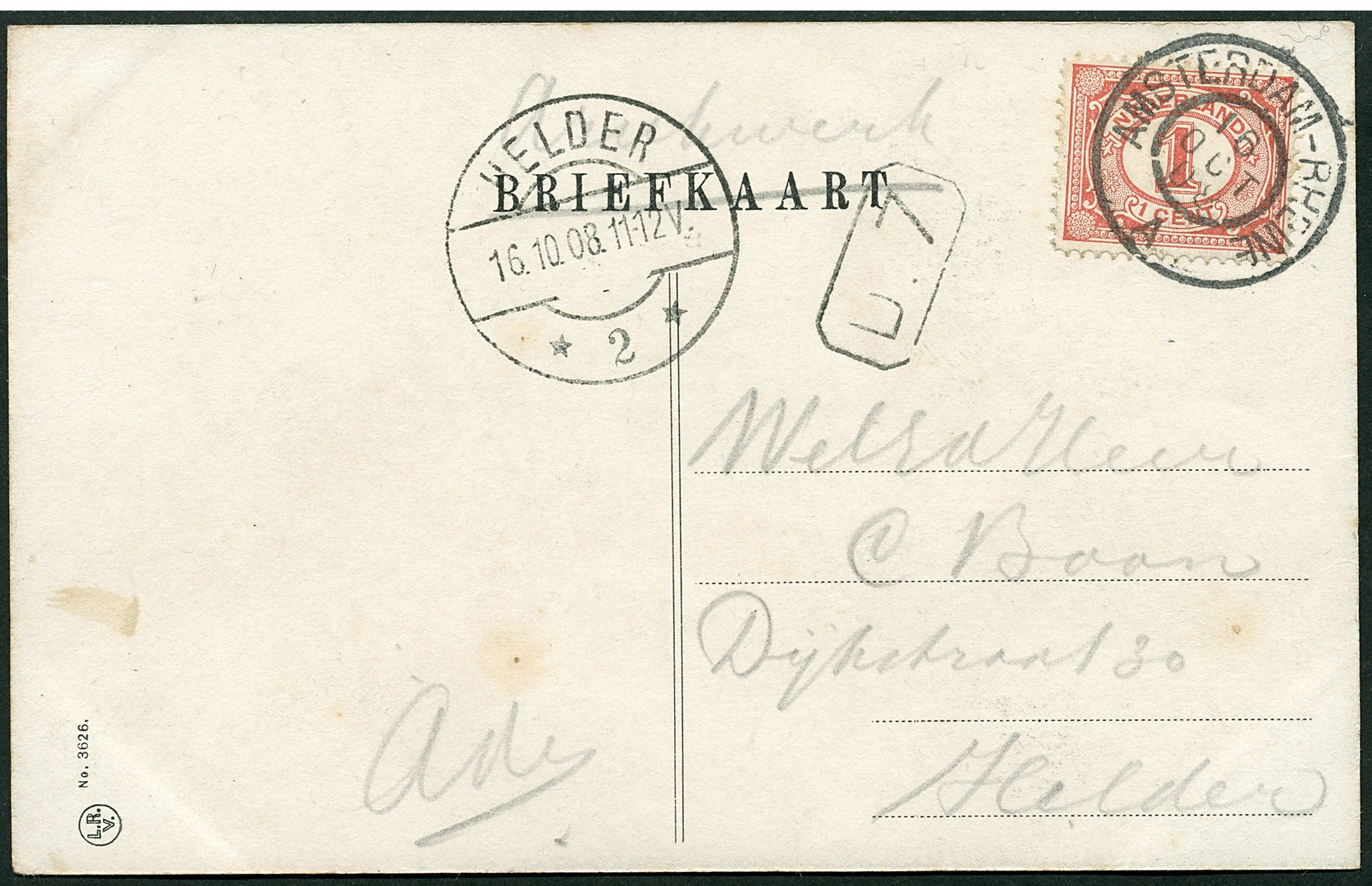 Schaarse grootrondstempels op prentbk. van Amsterdam-Rheine/A 16-10-1908 en Rotterdam-Z:Beijerland/II 2-1-1914 (1 of 2?)
