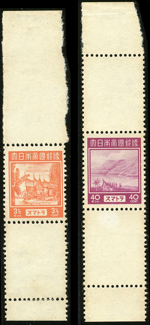 Sumatra. Definitive issue. Perforated colour proof 40 cent violet-red, taken from a mini sheet of 10 stamps with large upper and lower margins, without gum. Not recorded for this value in the catalogue and Bessels (Kolff book, 2011, p.349). Also the 3½ cent no. 04pbd