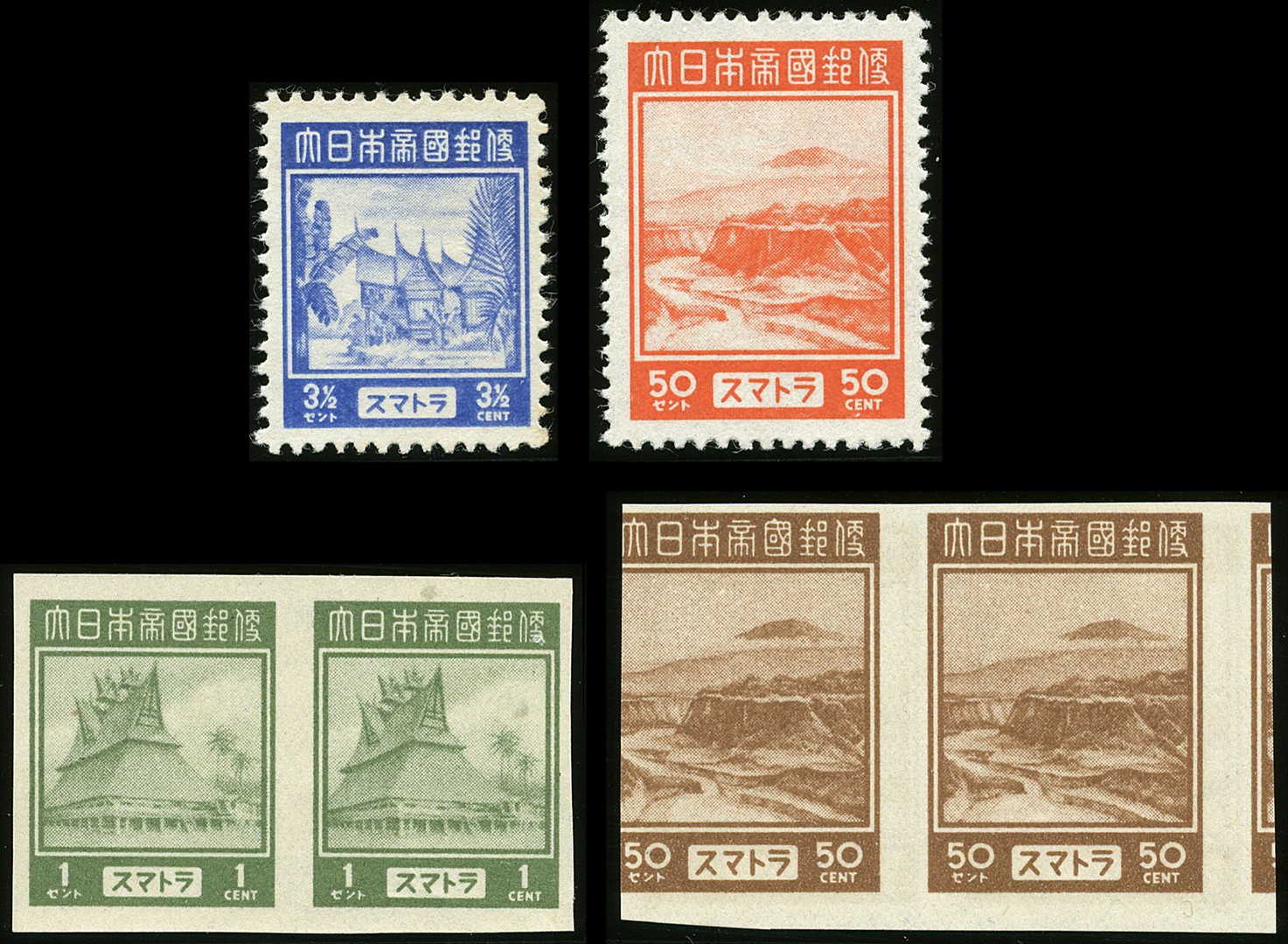 Sumatra. Definitive issue nos. 01/12 used, a selection of imperforated ungummed colour proofs including the 50 cent olive-brown in pair and printed on both sides (not listed), and 5 perforated ungummed colour proofs nos. 04pba, 04pbc, 11pba, 11pbc and 11pbd. € 400++