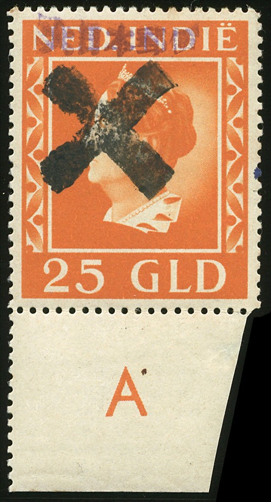 Sumatra. West Coast. 25 Gulden Van Konijnenburg with violet Dai Ni Hon Yubin overprint in combination with black cross overprint no. 870v/330z-58, unused with sheet margin. The black spot on the right is not a perf missing but part of a black cross overprint. Cert. ´Van Dieten, 2019´. € 900