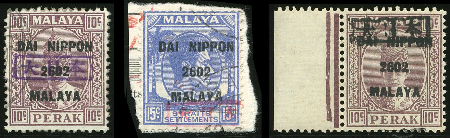 Sumatra. Tapanoeli. Dai Ni Hon overprint in frame on Malayan stamps with Malayan overprint nos. M11c with 211z and 821v used (Atjeh), M11c with 211z and 834z unused (unlisted) and M13 with 211z and 821r on M.O. fragment