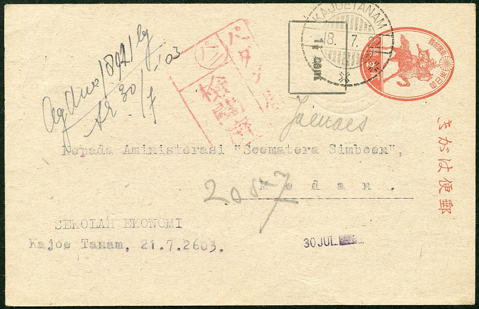 Sumatra. West Coast. 2 Sen Japanese postcard with 1½ cent in frame Bu.146 from Kajoetanam 18.7.22 to Medan. Censor Bu.14a from Padang