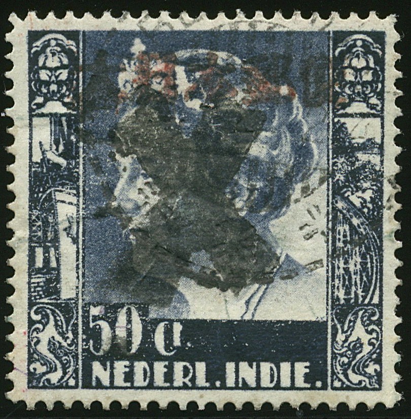 Sumatra. Riouw. 50 Cent Kreisler with reddish violet Dai Ni Hon Yubin overprint in combination with black cross overprint of Bengkalis no. 881r/386z-34a, cancelled Bengkalis 18.2.24. A rare stamp! Signed Boekema. € 650