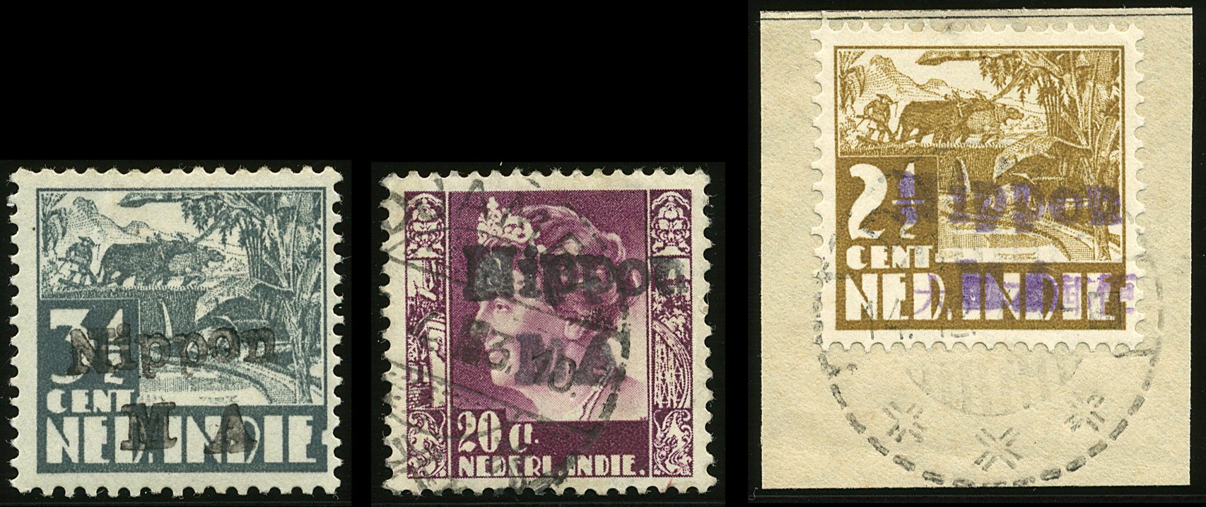 Sumatra. Djambi. Black or violet overprint Nippon/MA on Kreisler nos. 421z-15b, 16b, 17b (damaged), 18b (used), 22b (faults), 26b (faults), 27b (used, not recorded), 422z-19a, 20b (faults), 21b (faults) and in combination with violet small Dai Ni Hon Yubin overprint nos. 871v/421v-17b unused and used, 20b used. Most signed Boekema. ca. € 775 (17b not counted, 27b not recorded)