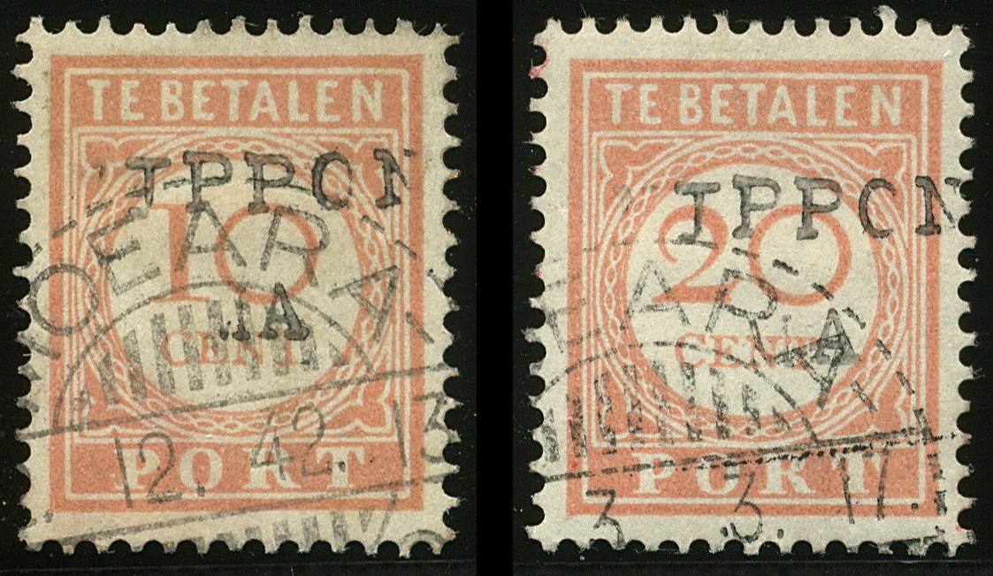 Sumatra. Djambi. Black overprint NIPPON/MA on postage dues 10 and 20 cent nos. 433z-82a and 84a (signed Boekema), both cancelled Moeara-/Boengo. € 280