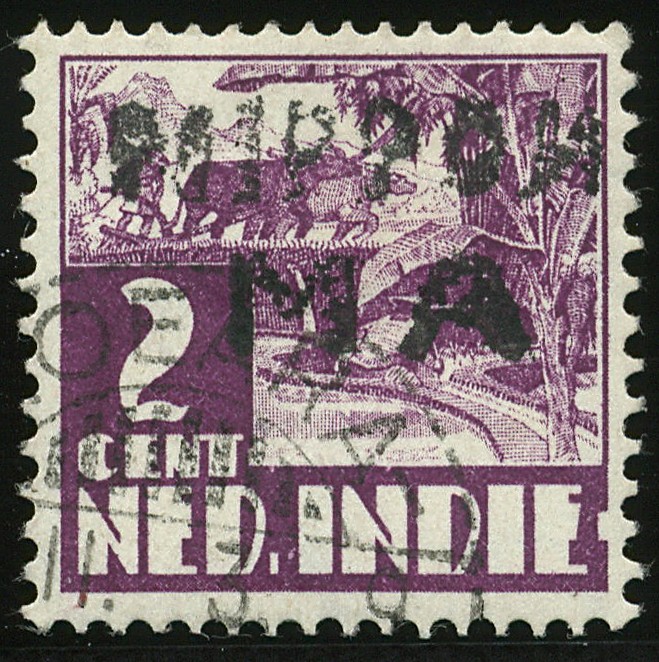Sumatra. Djambi. 2 Cent Kreisler with black overprint NIPPON/MA no. 432z-16b, used. Signed Boekema. Rare stamp! € 300