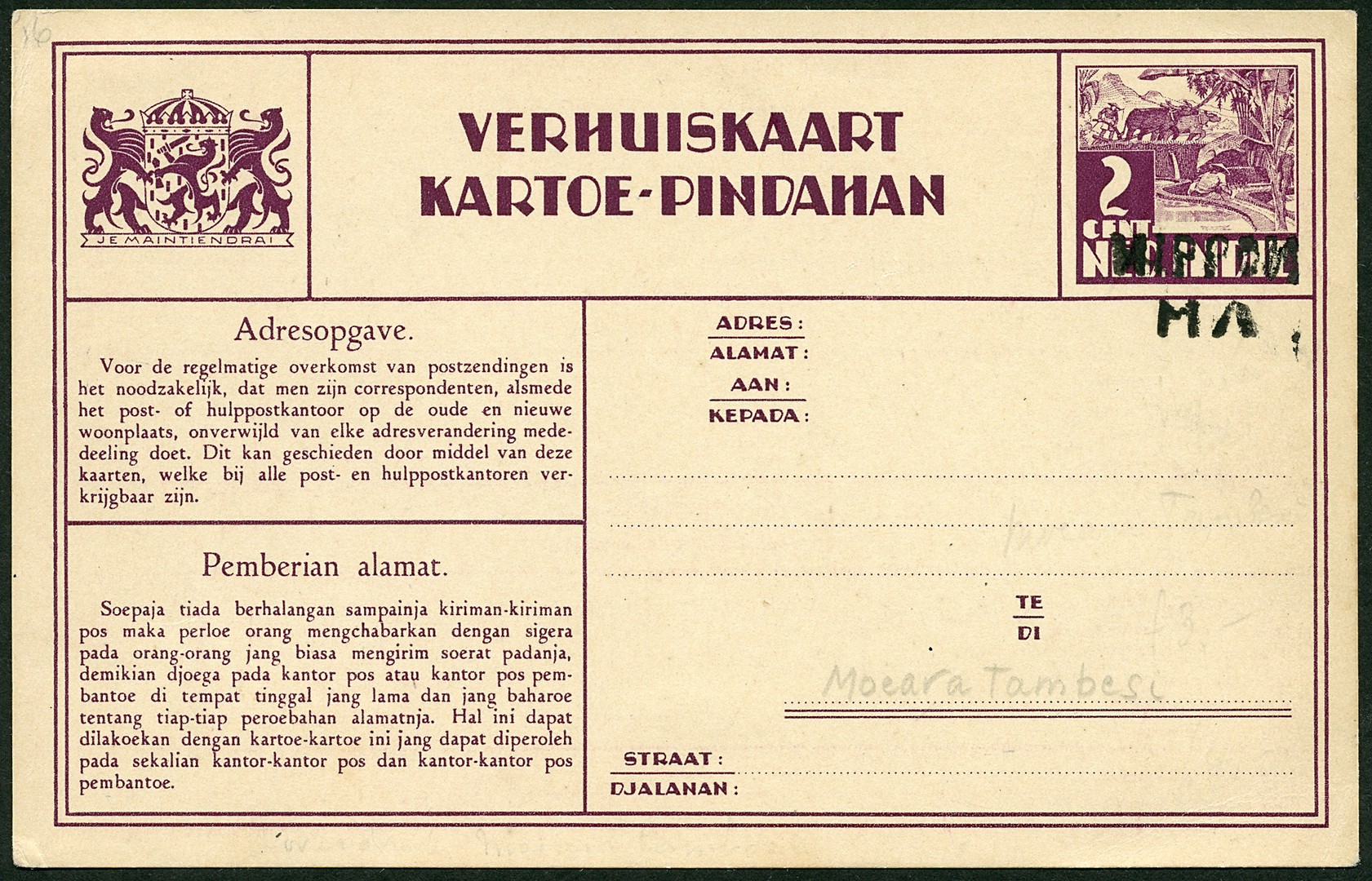 Sumatra. Djambi. Change of address card type Kreisler with black overprint NIPPON/MA type 432 Bu.128, unused
