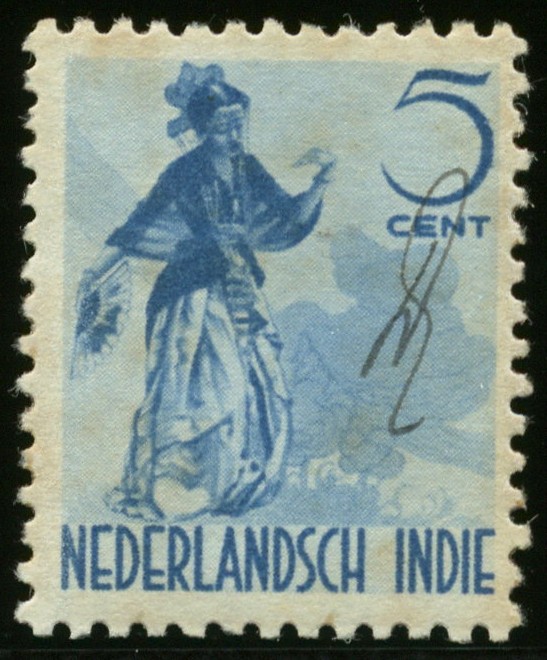 Sumatra. Palembang. Initial of postmaster Dahlan in bluish black ink, used locally in Tandjong Radja, on 5 cent Dancer no. 515z-70, unused. € 300