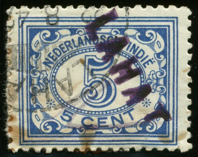 Sumatra. Palembang. 5 Cent Numeral with violet straight-line place-name overprint LAHAT no. 542v-42, cancelled Lahat 22.8.42. Very rare! € 500