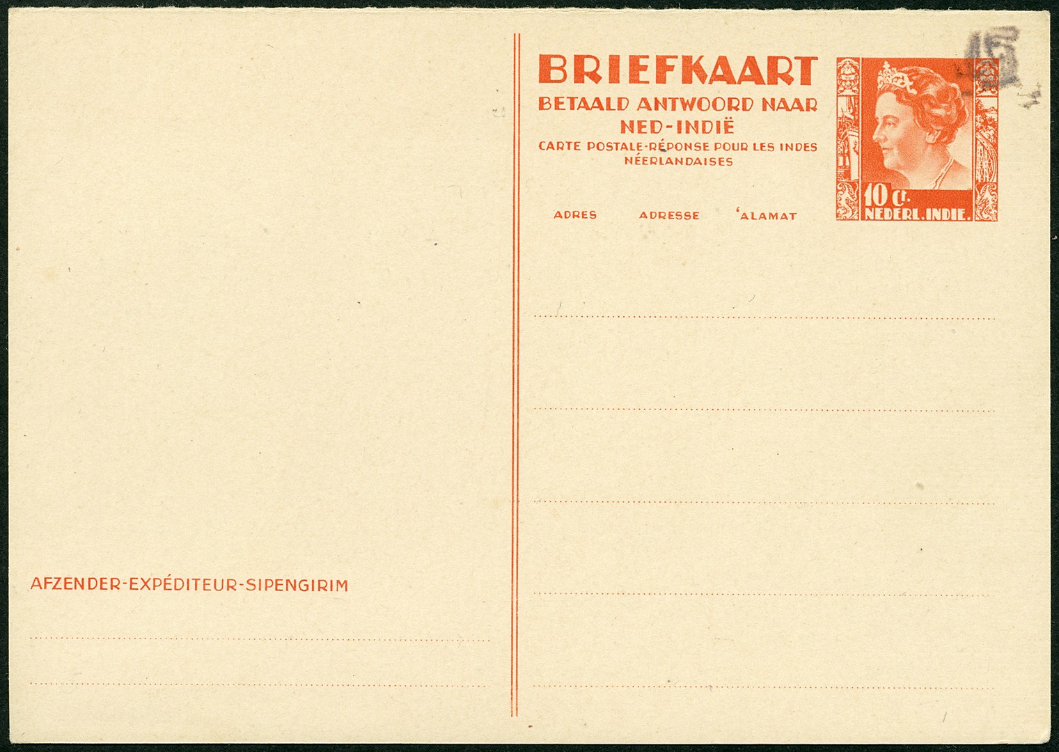 Sumatra. Palembang. 10 Cent reply-paid card type Kreisler (the outward card has been removed, see sale 642 lot 1436) with black monogram overprint MSL of postmaster Mas Slamet of Batoeradja type 531, Bu.70 (RRR), unused. The only one recorded! Cert. ´Van Dieten, 2019´
