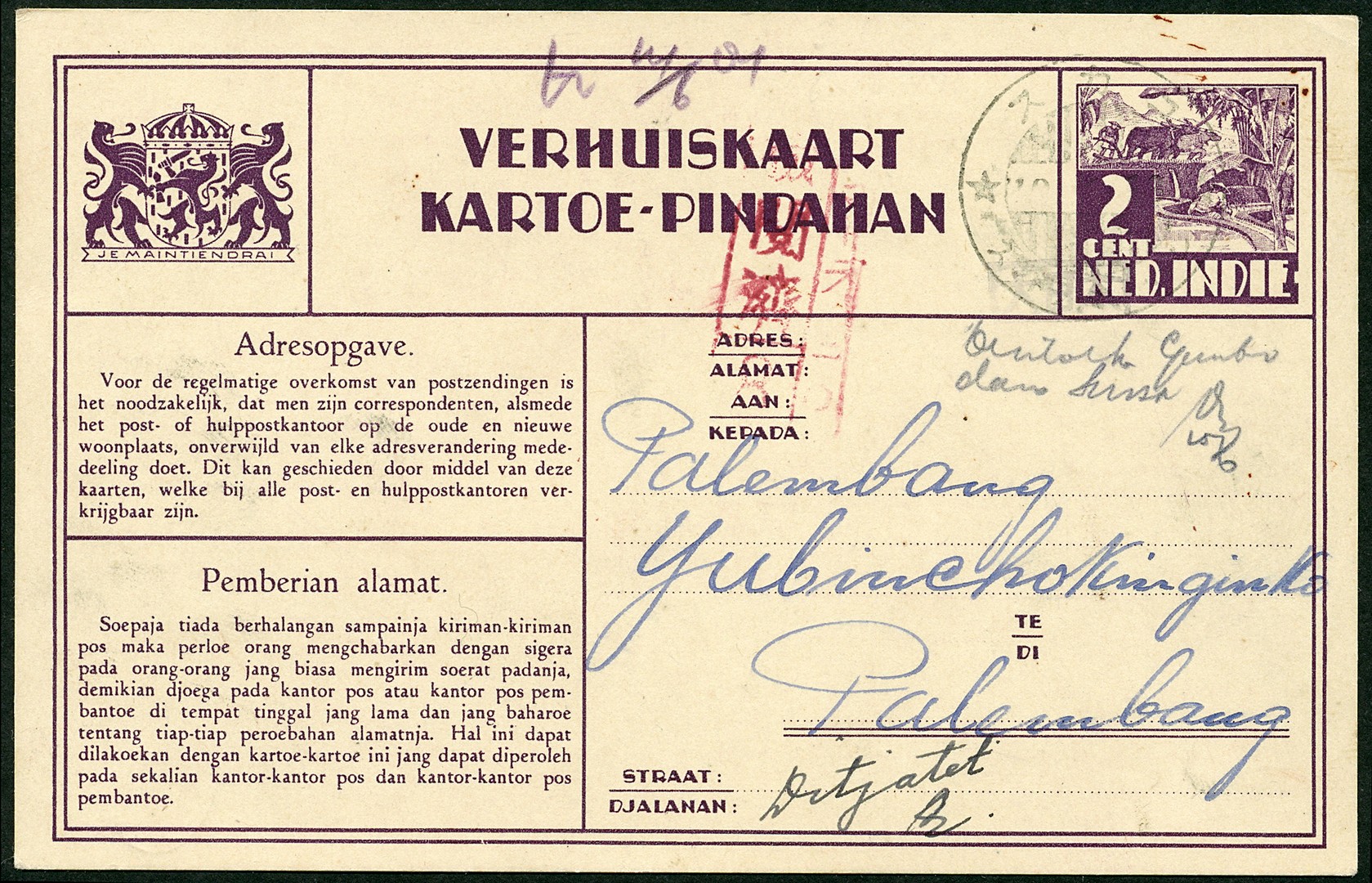 Sumatra. Palembang. Change of address card type Kreisler with black Dai Ni Hon overprint in straight frame Bu.168a from Sekajoe 19.6.16 to Palembang. Censor Bu.JC15