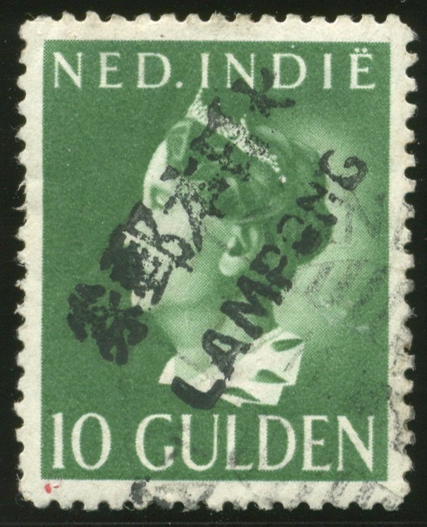 Sumatra. Lampong. 10 Gulden Van Konijnenburg with black Dai Ni Hon Yuken Lampong two-line overprint no. 611z-57, cancelled Tandjong-/Karang. Signed Boekema. Very rare stamp! Cert. ´Van Dieten, 2019´. € 700