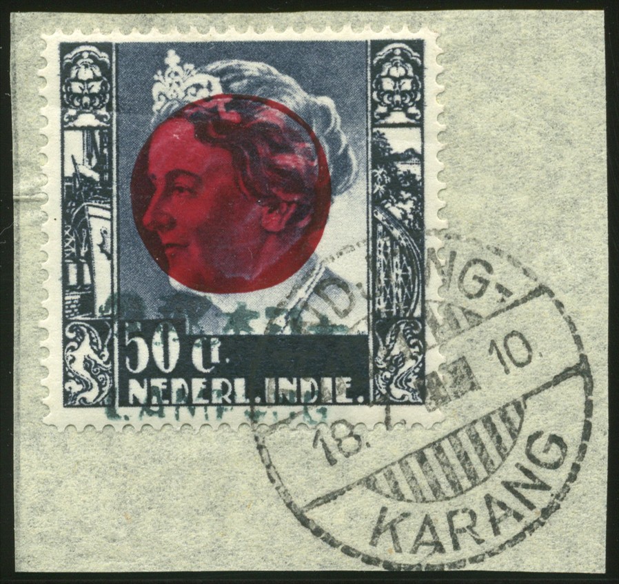 Sumatra. Lampong. Dai Ni Hon Yuken Lampong two-line overprint combined with a red wax disk to cover the image of the Queen type 621r on 7 stamps type Kreisler nos. 610g-26b (2x), 610v/28a, 610v-28a (unused), 610v-31b (unused), 610g-32b (on piece, faults and not counted) and 610g-34a (on piece, c.t.o.). Some signed Boekema. € 280