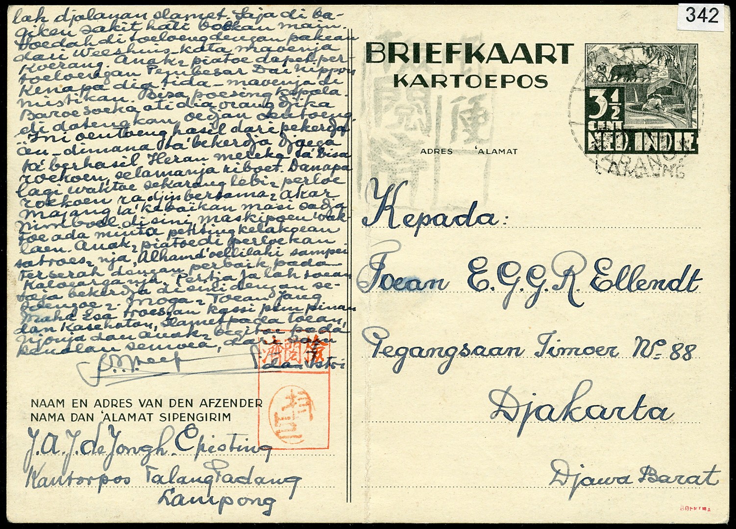 Sumatra. Lampong. 3½ Cent postcard with black Dai Ni Hon Yuken Lampong two-line overprint Bu.101 (crease) written in Giesting on 24-5-2603 from Tandjong-/Karang 7.6.3 to Djakarta. Censor Bu.JC14c from Palembang and in red Bu.JC18a (Vr.202a, rare). Signed Boekema