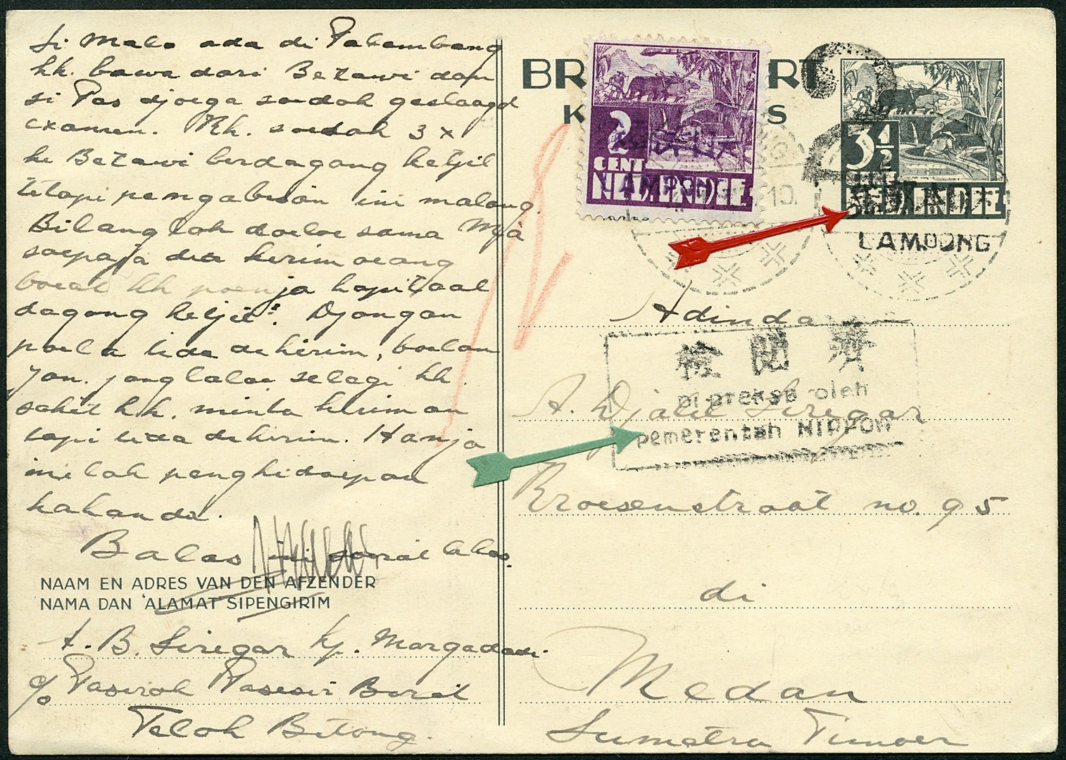 Sumatra. Lampong. 3½ Cent postcard with black Dai Ni Hon Yuken Lampong two-line overprint re-valued by large black 2 Bu.109 with 2 cent Kreisler stamp with violet Dai Ni Hon Yuken Lampong two-line overprint adjacent, written in Margodadi on 1 Jan 2063 from Telokbetong -4.1.3 to Medan. Censor JC19c. Very rare postcard!