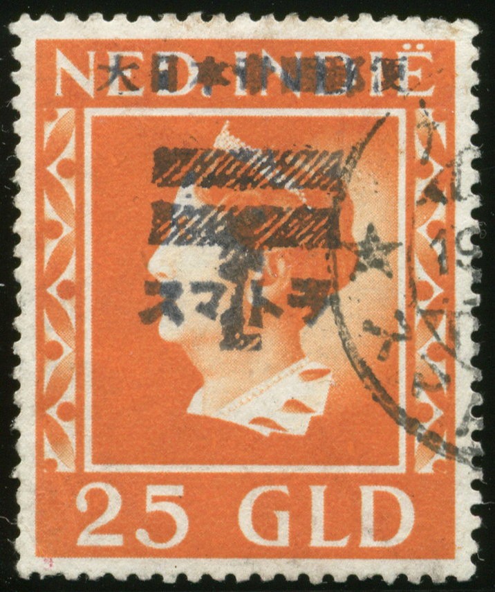 Sumatra. General Printings. 25 Gulden Van Konijnenburg with black handstamped T-overprint no. 912z-58, used. Signed Boekema. € 340