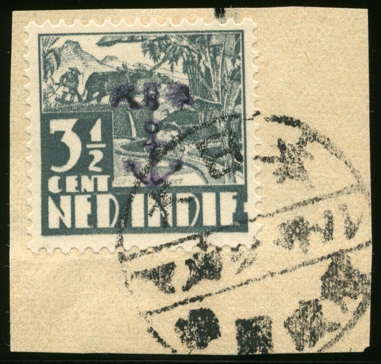 South Celebes. 3½ Cent Kreisler with black Makasser anchor overprint no. 112z-69 on piece, cancelled Makasser. € 135
