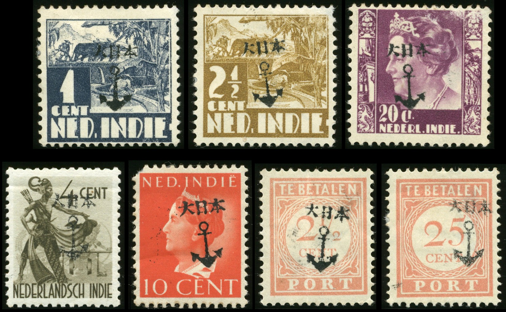 South Celebes. Provisional issue of Takalar. Black Makasser anchor overprint type 119 used temporarily in Takalar on 1, 2½ and 20 cent Kreisler nos. 119z-15b, 17b and 27b, 4 cent Dancer no. 119z-69, 10 cent Van Konijnenburg no. 119z-43II, 2½ and 25 cent postage due nos. 119z-78a and 85a. Extremely rare, only a few recorded, however all stamps in this lot have faults (thin spots, missing corner or crease). [€ 1730]