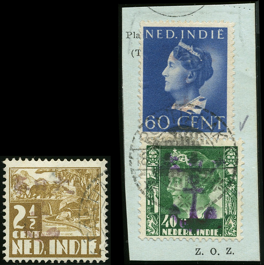 West Borneo. Small anchor overprint in several types 421 and 431/432 in different colours on 28 unused and used stamps (Kreisler 25x), Numeral (1x) Van Konijnenburg (1x) and Dancer (1x). Illustrated 421r-17b and 52g. Some signed Boekema. Ca. € 775