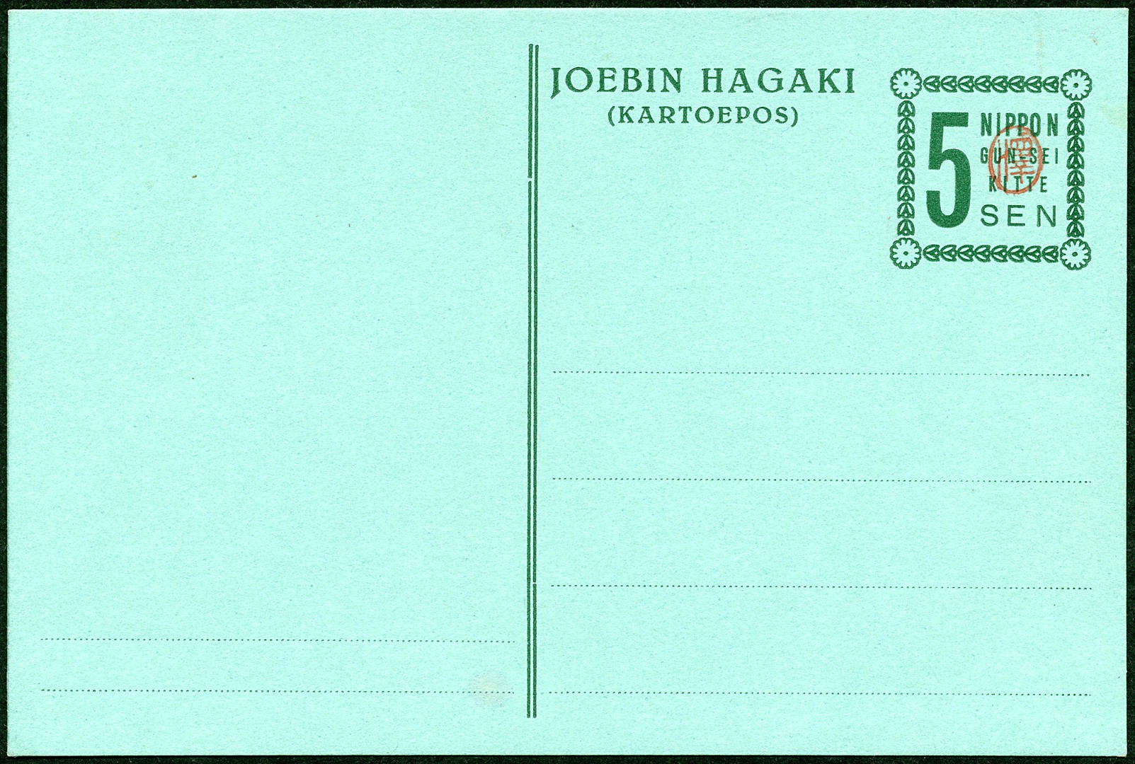 LESSER SOENDA ISLANDS. 5 SEN GUN-SEI KITTE (= MILITARY STAMP) POSTCARD ON THICK LIGHT GREEN PAPER WITH RED OVAL PERSONAL SEAL FROM CAPTAIN SAWA, FROM FLORES, Bu.282a, UNUSED. EXTREMELY RARE, ONLY A FEW UNUSED COPIES ARE RECORDED (EVEN RARER THAN THE FEW USED CARDS). SEE: J.R. VAN NIEUWKERK, p.202-203. EXHIBITION ITEM! CERT. ´VAN DIETEN, 2019´