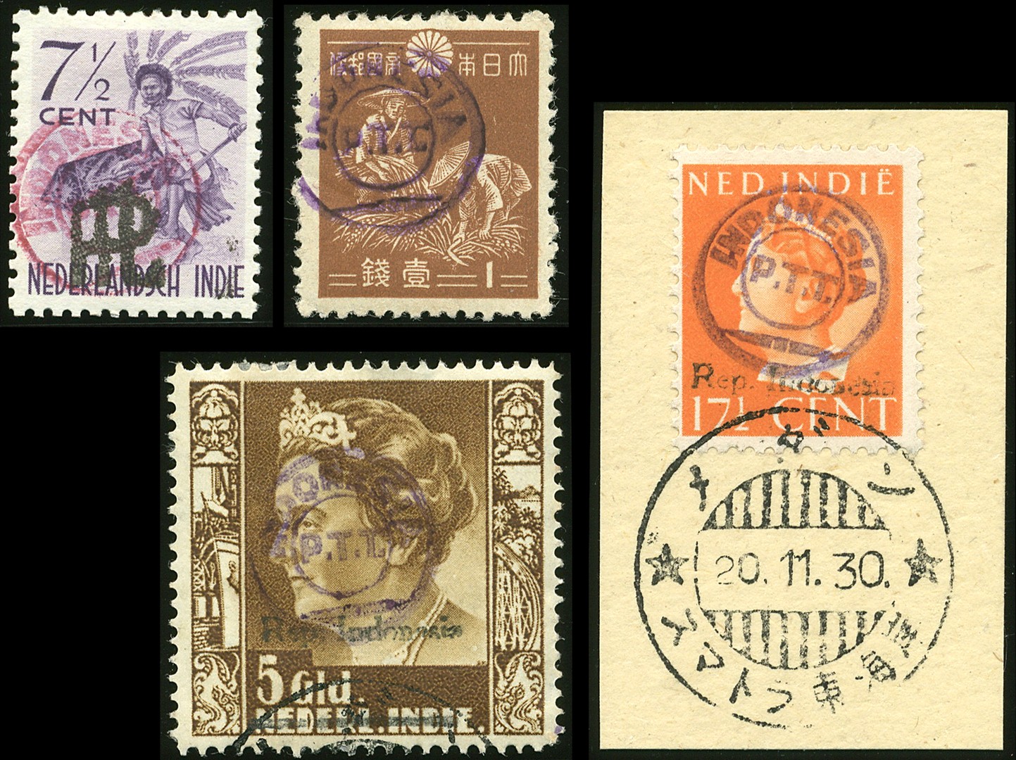 Republik. North Sumatra. Collection of 99 for the most part different stamps all with handstamped overprint INDONESIA P.T.T. between two circles, small type 222 (16 mm diameter), in different colours, most stamps with other overprints as well, mainly unused, some c.t.o. Medan, and some are very difficult to find!