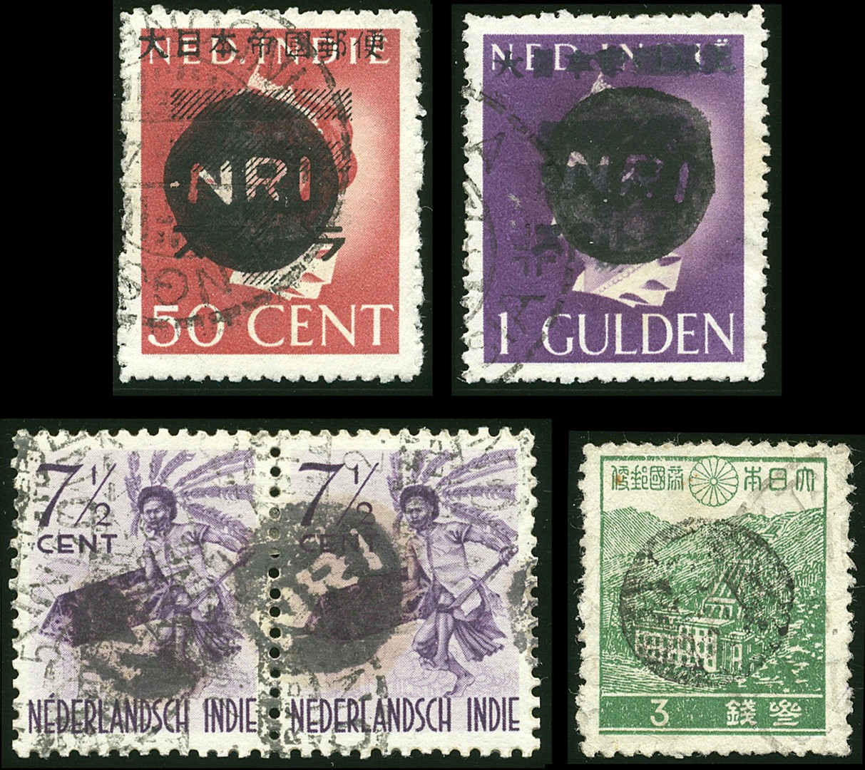 Republik. North Sumatra. 21 stamps (20 different, 1 pair) all with handstamped overprint disc with NRI in negative (14 mm diameter) type 231 in black or violet, most stamps with other overprints as well, mainly unused, some cancelled, and most of them quite scarce