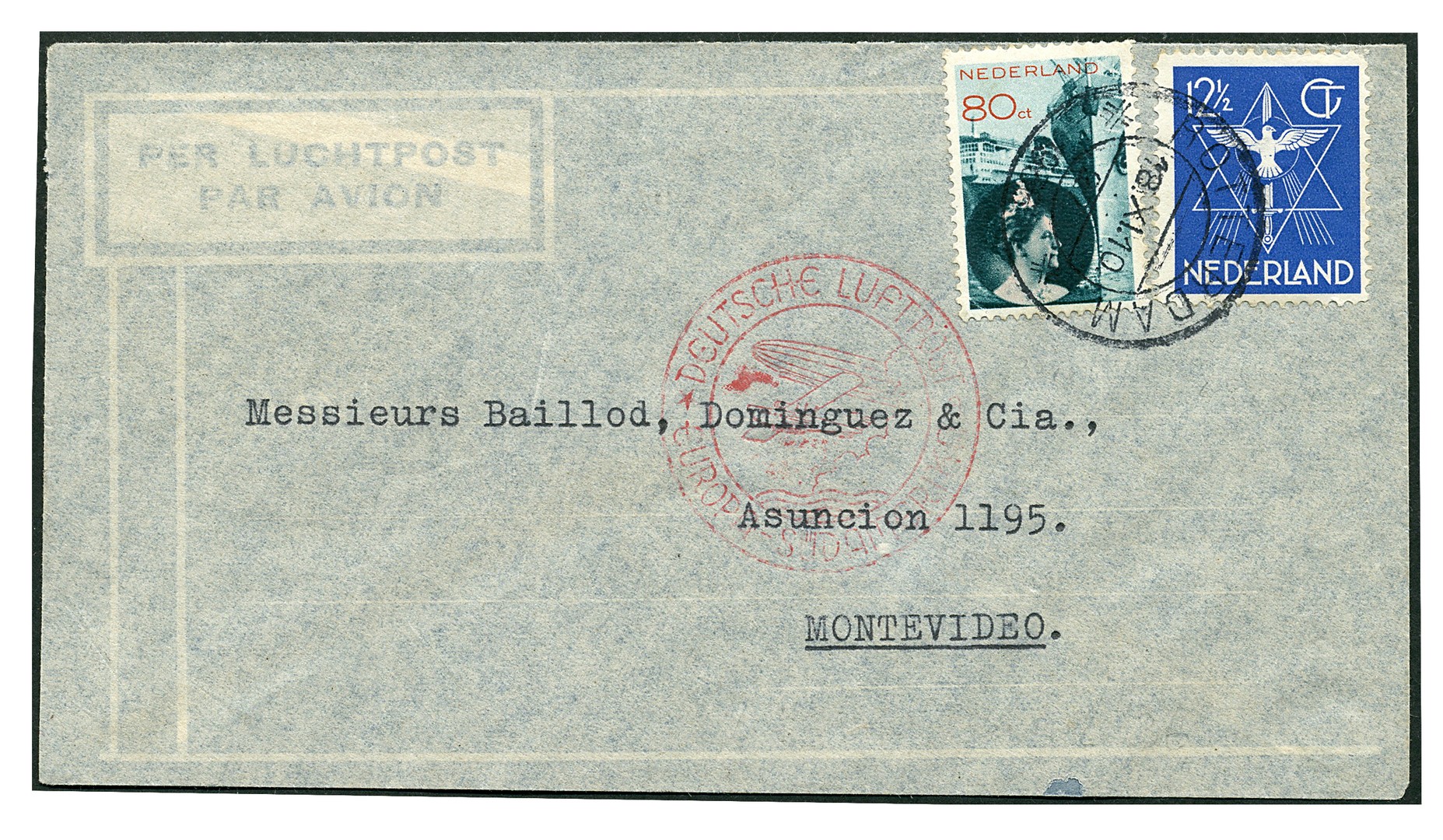 Pendelvaart Bathurst-Pernambuco 22-11-36. Zakelijke post van Rotterdam 18-11 via Berlijn (rood luchtpoststempel met letter a) over Sevilla naar Bathurst in gambia. op 22-11 aan boord van de Graf Zeppelin, landing Pernambuco en van Recife per condor over Rio naar Montevideo. Nederlandse post via deze pendeldienst is buitengemeen zeldzaam. Nederlandse Zeppelin-rariteit. Attest Dieter Leder (1999). VH.138.LHP