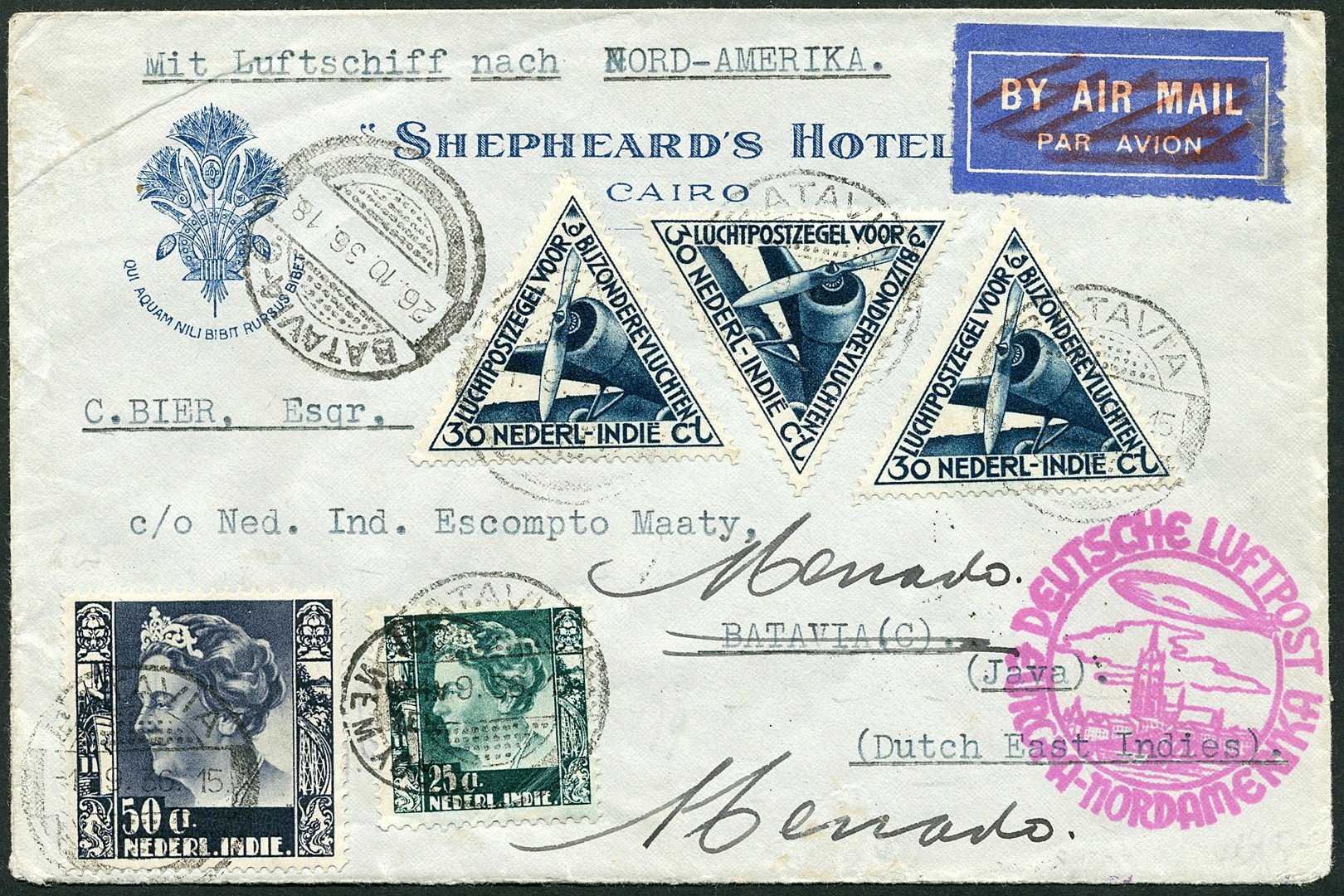 Zeppelinpost. Ned.- Indië. 8e Vaart naar Noord-Amerika, aankomst New York 20-9-1936, terug over Batavia-C. 26-10 naar Menado 14-11. Slechts 129 brieven meegevlogen. VH.I-A.9. € 400