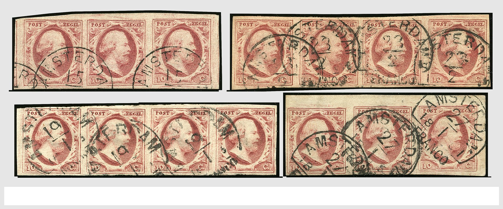 EMISSIE 1852, 10 cent rood plaat VI nr. 2l, 9 losse zegels, 15 paren, 6 strippen van drie en 2 strippen van vier, alles gepositioneerd en in uitgezochte kwaliteit w.o. breed tot zeer breed gerande exemplaren, rand- en hoekstukken en diverse mooie afstempelingen. Schaars materiaal van deze plaat!