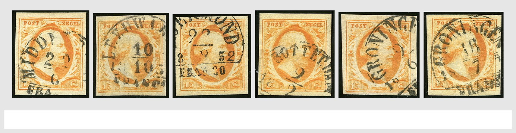 EMISSIE 1852, 15 cent, 56 mooi tot zeer breed gerande prachtexemplaren van verschillende posities, en 2 prachtparen