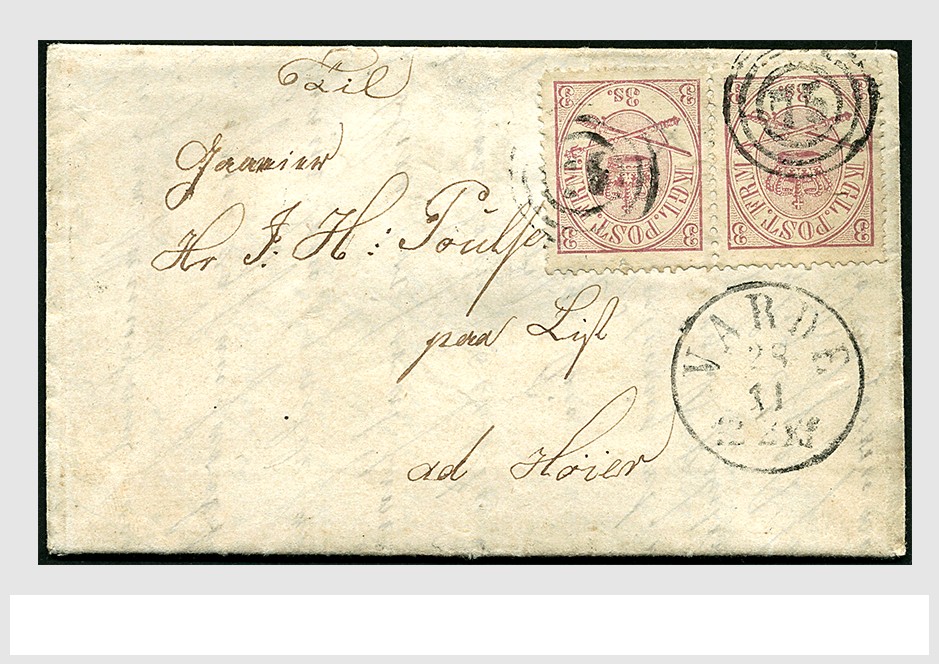 DENMARK, complete cover in very fine quality with wax seal on the back bearing 3s. Mi.12A in pair from Varde 28 Nov 1865 to Hoyer 30 Nov