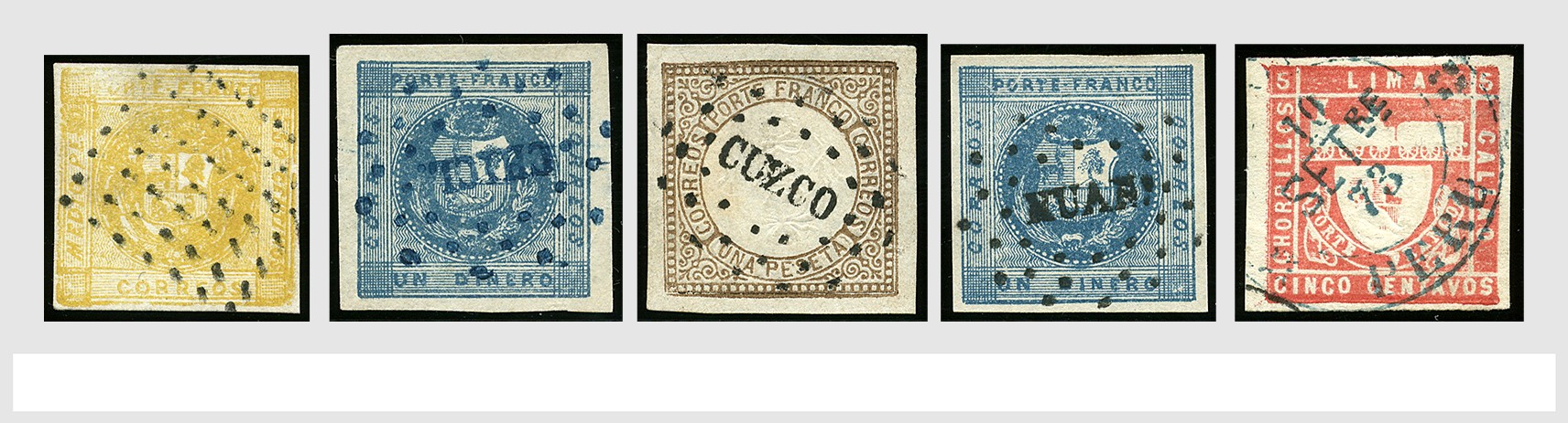 PERU 1858-1873, kleine gebruikte verzameling op insteekblad, waarbij betere nrs. en paren, o.a aanwezig Mi.4 en 5, meest met mooie afstempelingen!