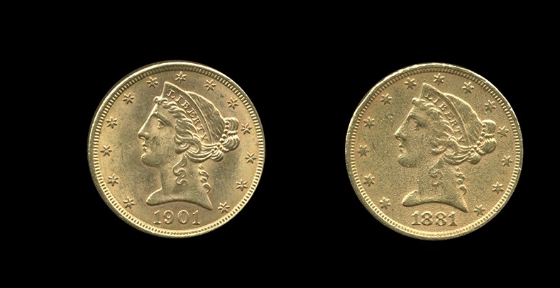 USA, 5 Dollar Goud 1881S 'Coroned Head' en 5 Dollar Goud 1901 F/ZF