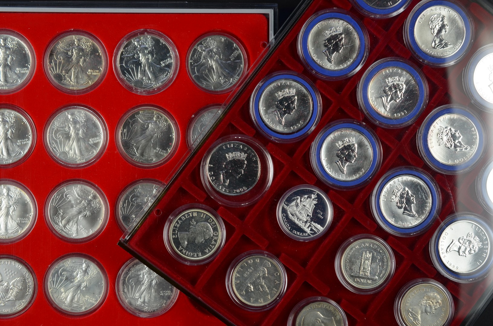 WERELD, Muntkoffer met Zilveren munten, waarbij 17 Zilveren Dollars en 9 stuks 5 Dollars (Maple Leaf), etc., etc.
