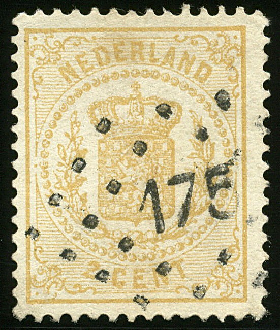 175 = Stadskanaal op 2 cent nr. 17. Prachtex. met zeer duidelijke afst. Zeldzaam op deze zegel. Cert. Koopman (1980): ´een prachtig duidelyk puntstempel, hetwelk op nr.17 tot heden onbekend was.´