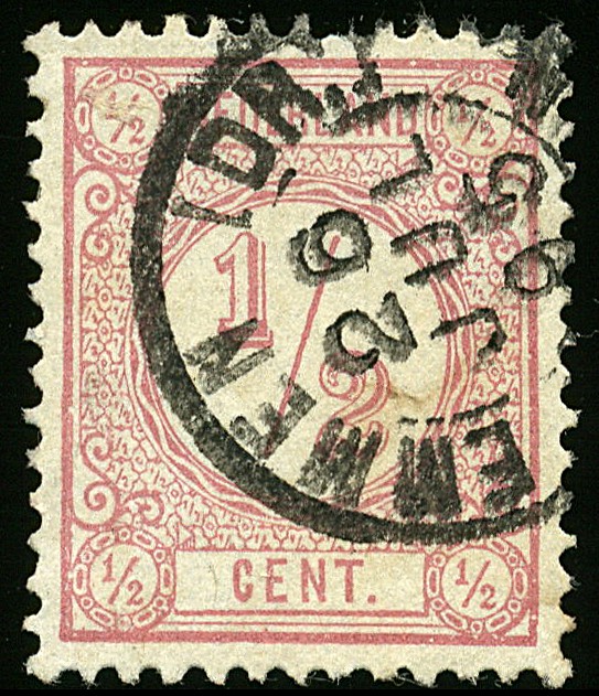 EMMEN [DR:] als postkantoor op ½ cent nr. 30b. Prachtex. met bijzonder mooie afst. Emmen heeft als postkantoor in dit geval i.p.v. met het kleinrond Emmen gestempeld met het oude stempel toen Emmen nog hulppostkantoor was. Zeldzaam! € 175