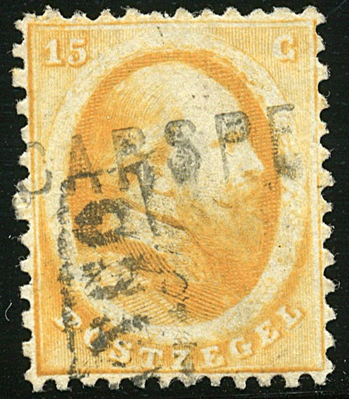 HOOG-CARSPEL (zwart, schreefloze letters) op 15 cent nr. 6. Prachtex. met goed herkenbare afst. en tevens Franco. Schaars op deze zegel!