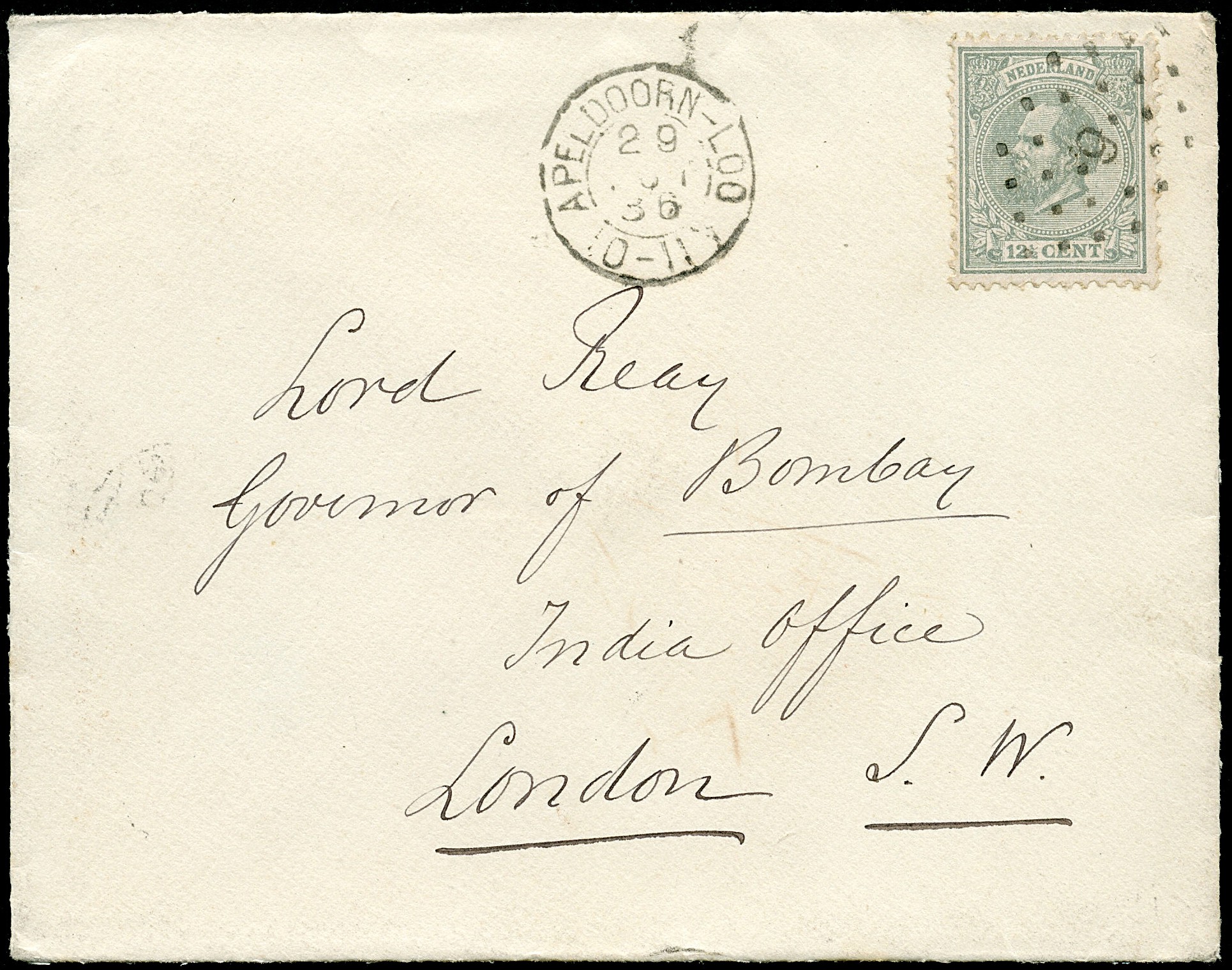 6 = APELDOORN-LOO. 12½ Cent nr. 22H (prachtex.) afgest. met puntstempel 6 (zonder extra punt onder de 6) op couvert van het bijpostkantoor Apeldoorn-Loo 29-10-1886 naar een Lord te Londen 30-10-1886. Prachtige kwaliteit van de afstempelingen!