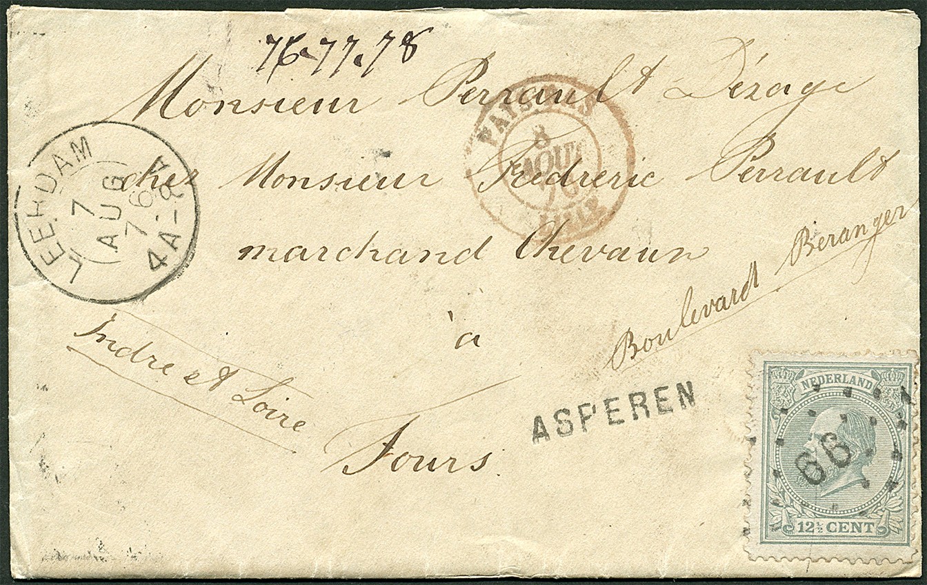 66 = LEERDAM. 12½ Cent nr. 22H (prachtex. met druktoevalligheid ´wrat op de neus´) afgest. met puntstempel 66 op envelop met ingesloten brief van hulppostkantoor Asperen (naamstempel zonder schreefletters) over Leerdam 7-8-1876 (tweeletter) en het grenskantoor Pays Bas/Lille 8-8-1876 naar Tours 9(?)-8-1876