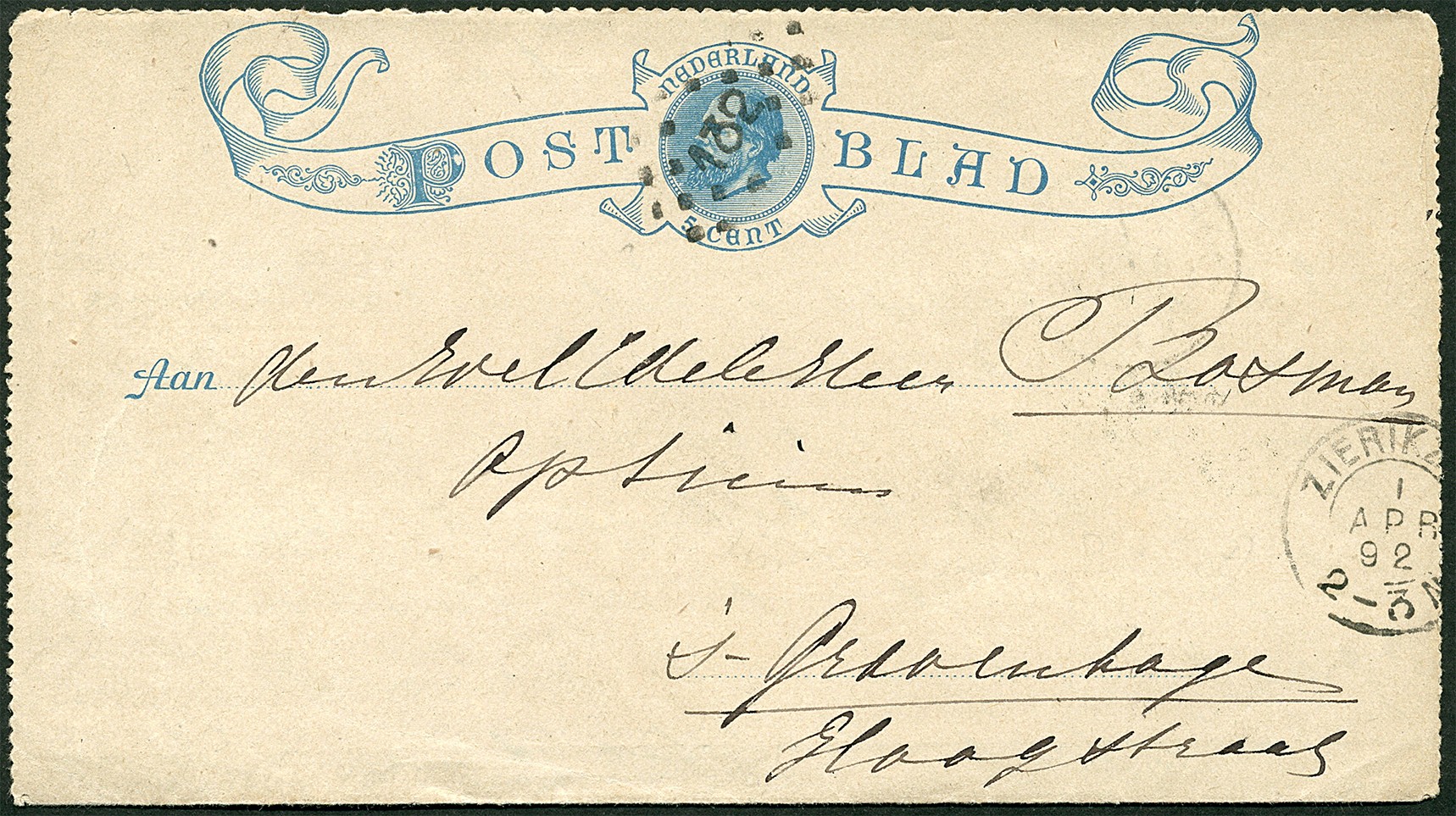 132 = ZIERIKZEE. Postblad G1 (klep ontbreekt) afgest. met puntstempel 132 van Zierikzee 1-4-1892 naar een opticien te ´sGravenhage. Eerste dag van officieel voorschrift dat o.a. postbladen met het puntstempel moeten worden afgestempeld