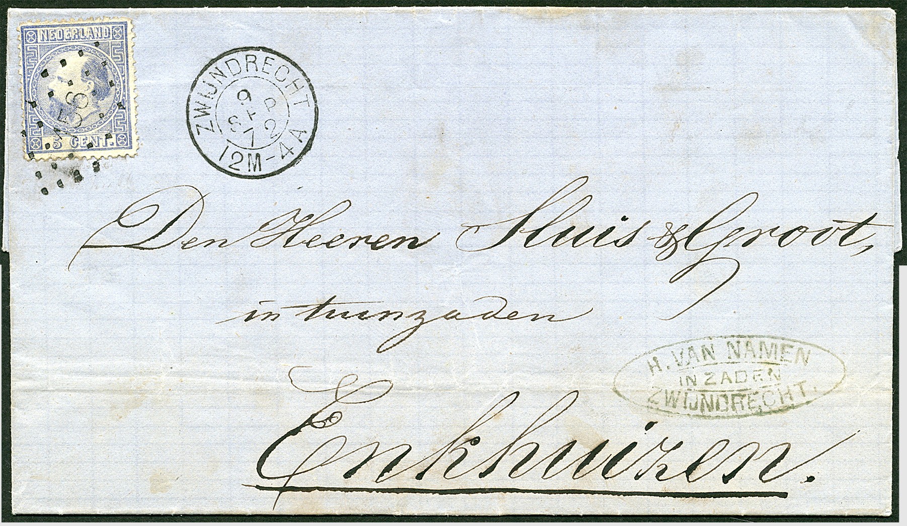 156 = ZWIJNDRECHT. 5 Cent nr. 7IIE (iets onregelmatig getand) afgest. met puntstempel 156 op cpl. brief van een zaadhandelaar van Zwijndrecht 9-9-1872 (tweeletter) naar een handelaar in zaad te Enkhuizen 10-9-1872. Puntstempel 156 is schaars op poststuk!