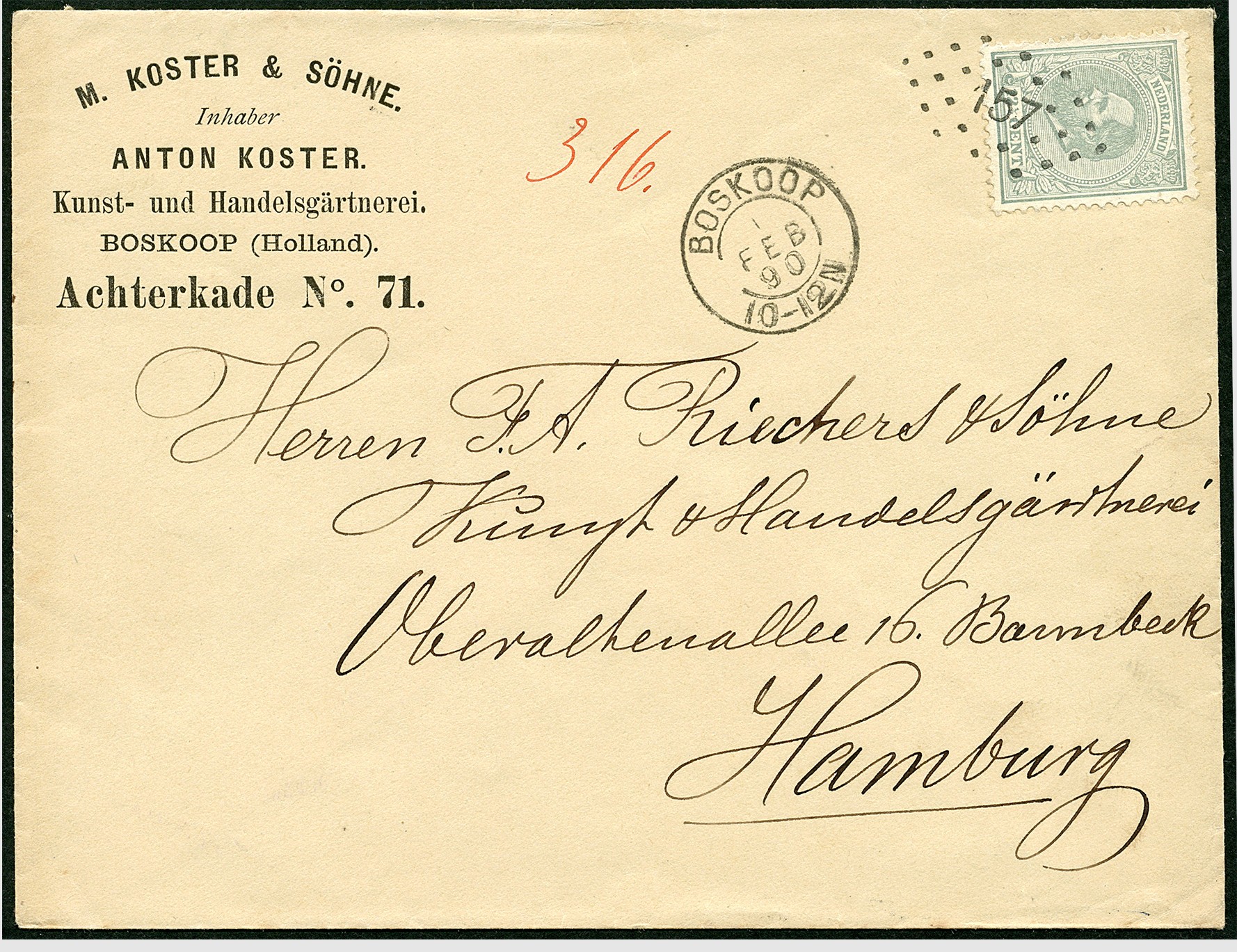 157 = BOSKOOP. 12½ Cent nr. 22L (prachtex.) afgest. met puntstempel 157 op prachtig firmacouvert van Boskoop 1-2-1890 naar een bedrijf te Hamburg 3-2-1890. Luxe afstempelingen op een bijzonder fris bewaard gebleven envelop!