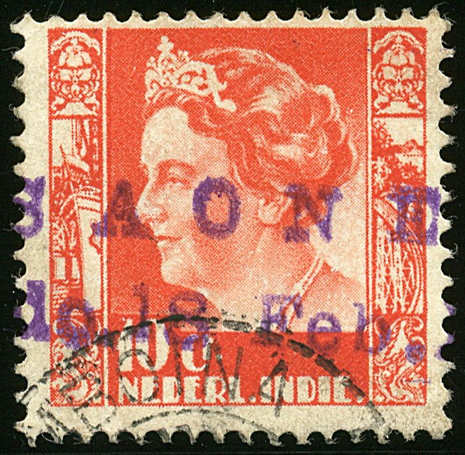 Violette afst. [Postbushouder]/SAONEK met datum do. 18 Feb. ... (Waigeo, Nieuw-Guinea) op 10 cent Kreisler met watermerk. Stempel van bestuursambtenaar. In welk jaar viel donderdag 18 februari?