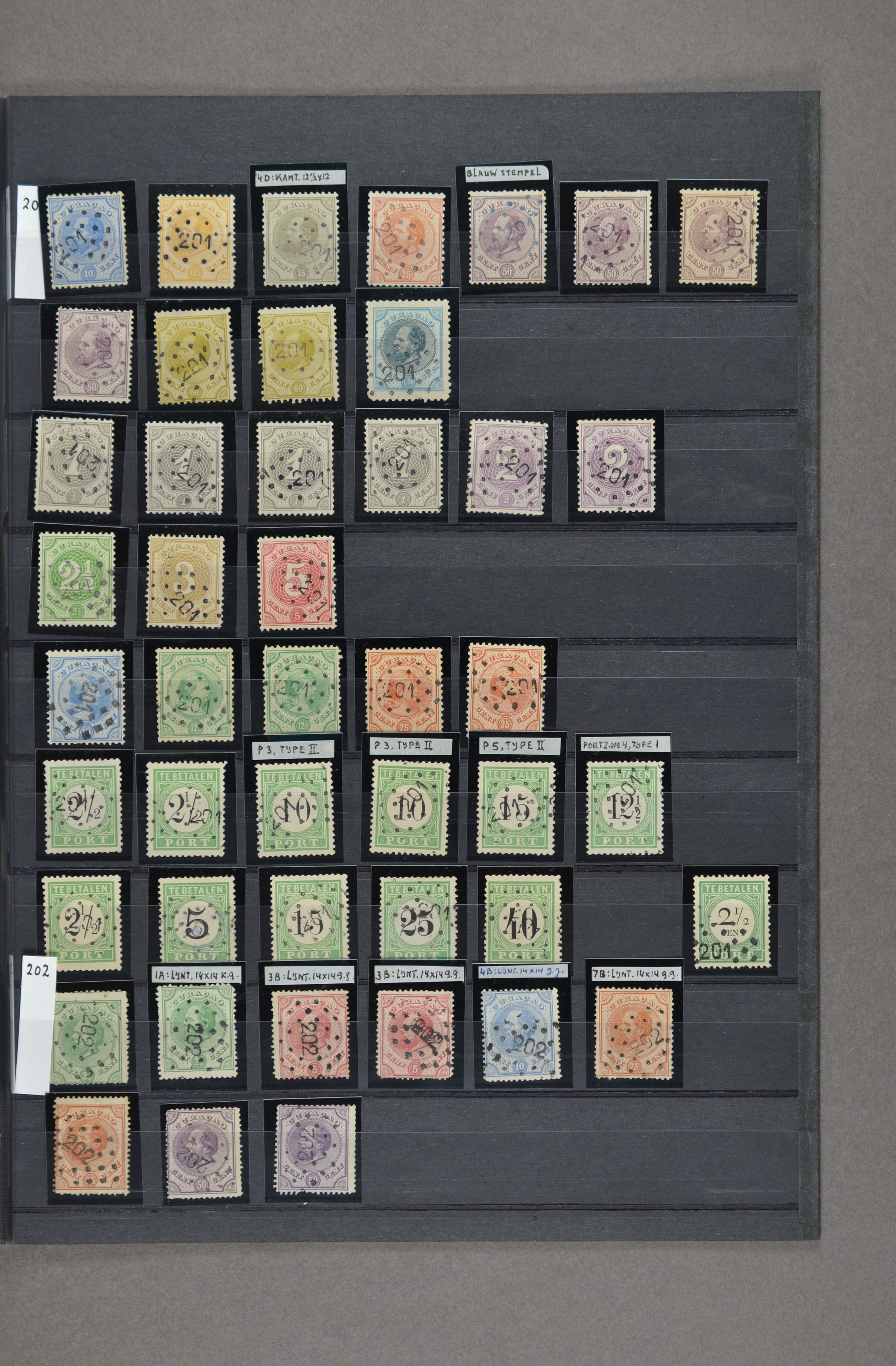Puntstempels op losse zegels op emissie 1873, 1889 en idem Port, wb. vele schitterende afdrukken, 201, 202 en 203 van Curaçao, 208 van St. Eustatius en 209 van Saba. Tevens blindstempel op Port 6